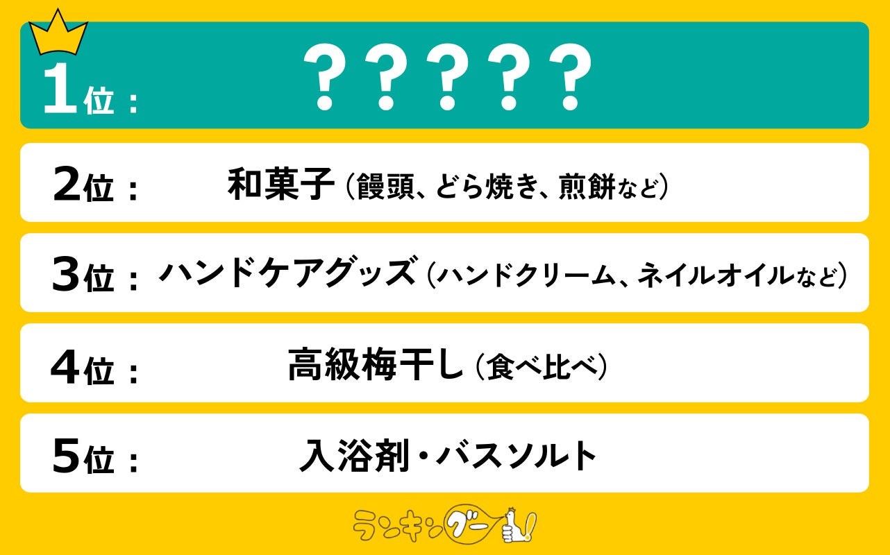 1位はチョコレートやクッキーなどの『洋菓子』に決定!2位は饅頭、どら焼き、煎餅などの『和菓子』。3位~5位は僅差で順位が決定しました。3位はハンドクリーム、ネイルオイルなどの『ハンドケアグッズ』。4位は『高級梅干し』。5位は『入浴剤・バスソルト』という結果となりました!