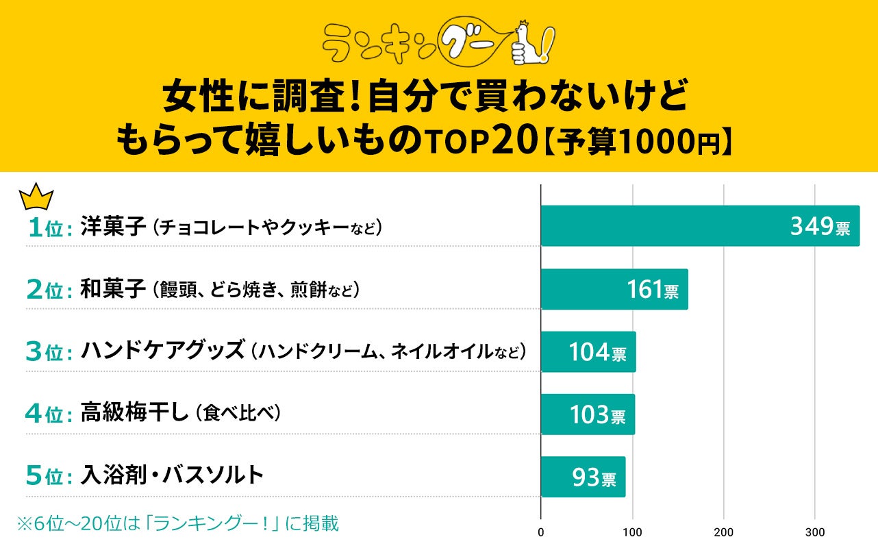 調査方法:株式会社CMサイトがインターネットリサーチした<女性に調査!自分で買わないけどもらって嬉しいものTOP20【予算1000円】>のアンケート結果を集計。