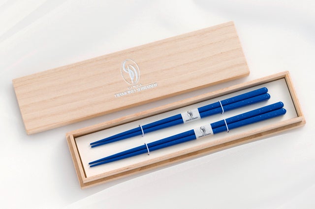 お箸専門店「箸蔵まつかん」と共同開発した「幸せの橋(箸)渡し」という意味が込められたオリジナル夫婦箸。ブランドコンセプトのギリシャ・エーゲ海とキラキラした輝く水面を表現しています。持ち手部分はフィットしやすく、実用的なアイテムで、食洗機にも対応しています。