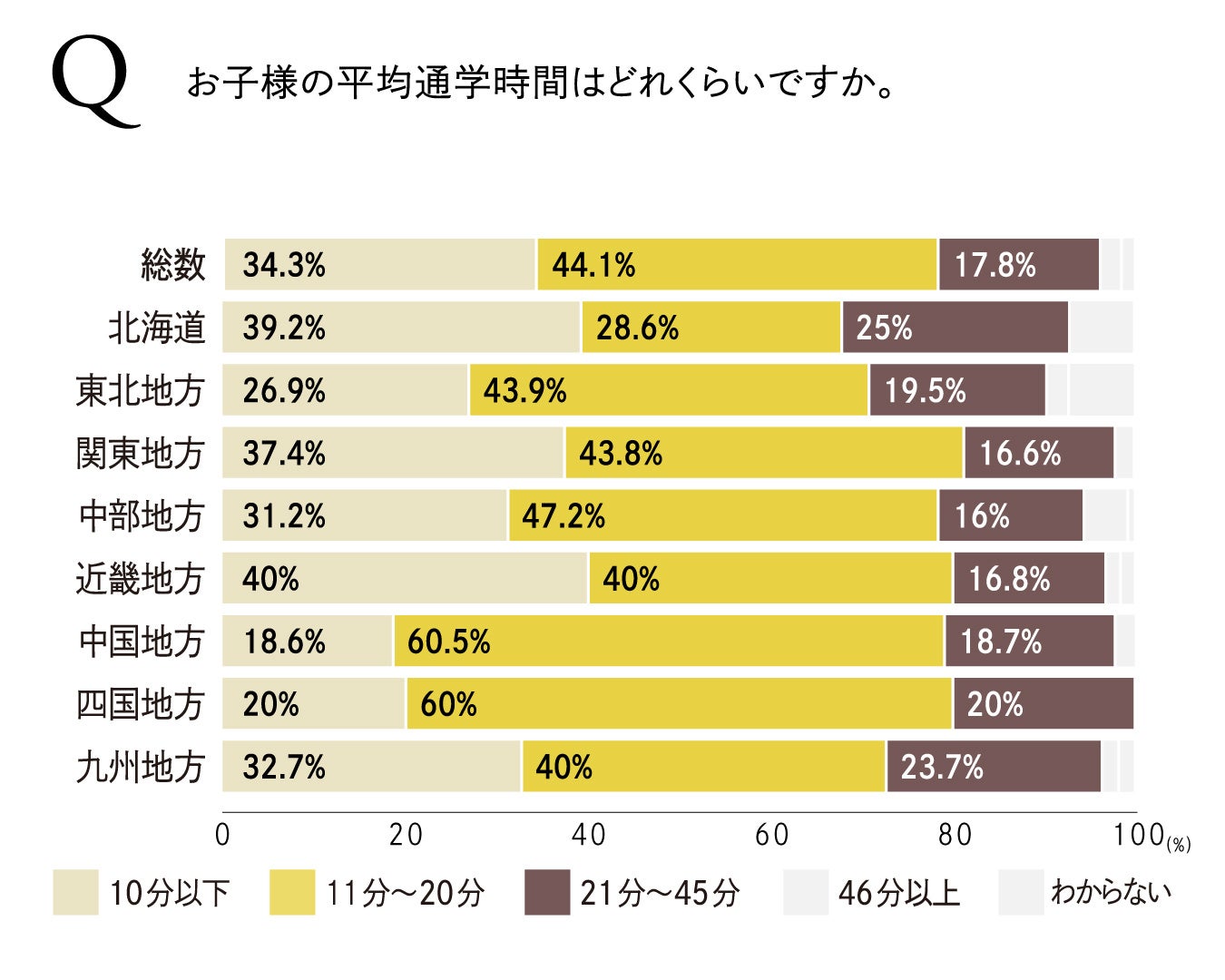 通学時間に関しては、「6~10分」が25.7%、「11~15分」が25.2%など、全国の半数は「15分以内」の通学と答えた一方、約4割は「16分以上1時間未満」かけて通っていると回答しました。また、東北地方だけは「16~20分」が最も多く、約3割の方が長い時間をかけて通っていることがわかり、地域差もある結果に。重たい荷物を持ちながら通学する、子どもたちへの負担が大きいことがわかりました。