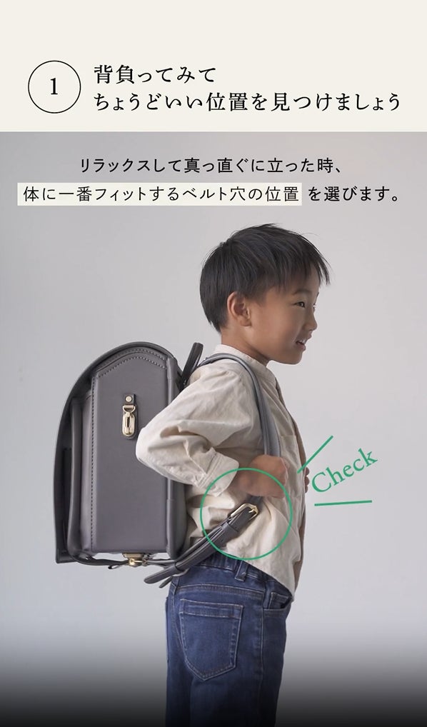 おこさまの体の成長、また厚着の季節には、肩ベルトの穴を調整して背負い心地のよい位置にあわせます。リラックスして真っすぐに立った時、体に最もフィットするベルト穴を選びます。ランドセルの上部が、肩の高さとほぼ同じになるとよいでしょう。ランドセルと背中との間に大きな隙間があると、体に負担がかかります。気をつけをした姿勢で、背中との間に大人の手のひらがスッと入るくらいがちょうどよい隙間です。新学期ごと・衣替えの季節に見直しするのがおすすめです。