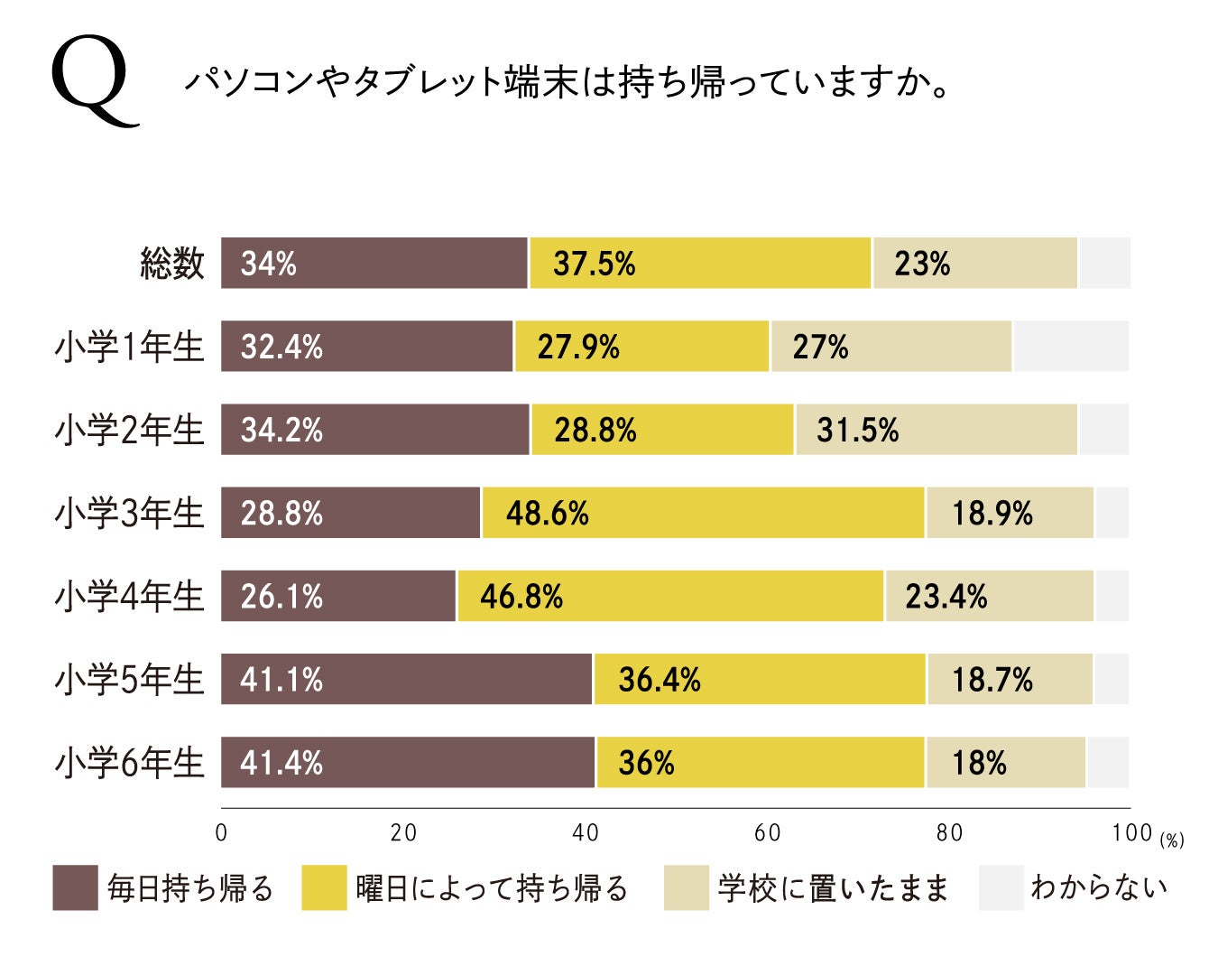 「パソコンやタブレット端末を持ち帰っていますか?」という質問に対しては、「毎日持ち帰っている」「曜日によって持ち帰っている」と答えた方が合わせて71.5%と、7割以上が1kg前後する端末(当社調べ)を持ち帰っていることがわかりました。その理由として、「家庭学習のため」「家で充電するため」といった声があげられ、学校にそのまま置いている方は23%にとどまりました。特に小学5年、6年生が「毎日持ち帰る」と回答率が高く、高学年の利用率の高さもうかがえます。
