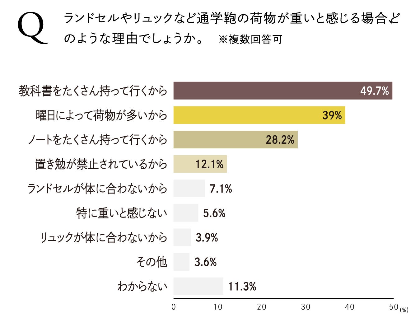 Q. ランドセルやリュックなど通学鞄の荷物が重いと感じる場合、どのような理由でしょうか。