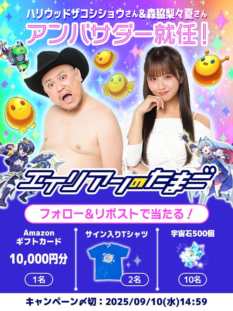 スマートフォン向けゲームアプリ『エイリアンのたまご(以下エリたま)』を運営する株式会社パオン・ディーピー(代表取締役:木原 海俊、本社:東京都北区)は、2025年9月4日(木)より、人気芸人のハリウッドザコシショウさん、人気急上昇タレントの森脇梨々夏さんのお二人が「エリたま」のアンバサダーに就任したことをお知らせいたします。