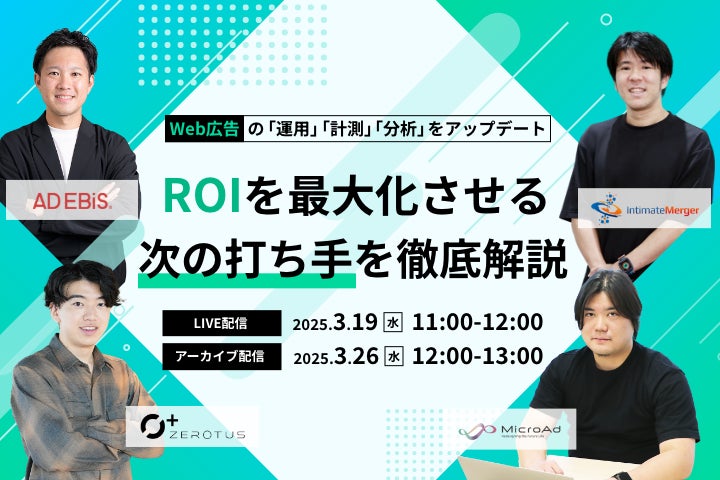 株式会社イルグルム(本社:大阪府大阪市北区 代表取締役:岩田 進、以下「イルグルム」)が提供する広告効果測定プラットフォーム「アドエビス」は、株式会社インティメート・マージャー(本社:東京都港区 代表取締役社長:簗島 亮次、以下「インティメート・マージャー」)と株式会社マイクロアド(本社:東京都渋谷区 代表取締役 社長執行役員:渡辺健太郎、以下「マイクロアド」)と株式会社ゼロタス(本社:東京都渋谷区 代表取締役:一戸 悠河、以下「ゼロタス」)と共同でROIを最大化させる打ち手を紹介する無料オンラインセミナーを2025年3月19日(水)に開催することをお知らせします。