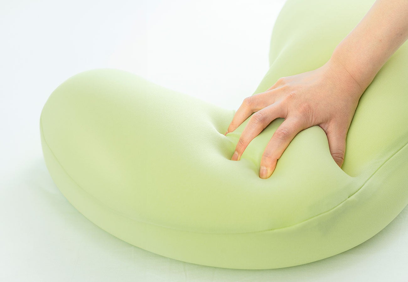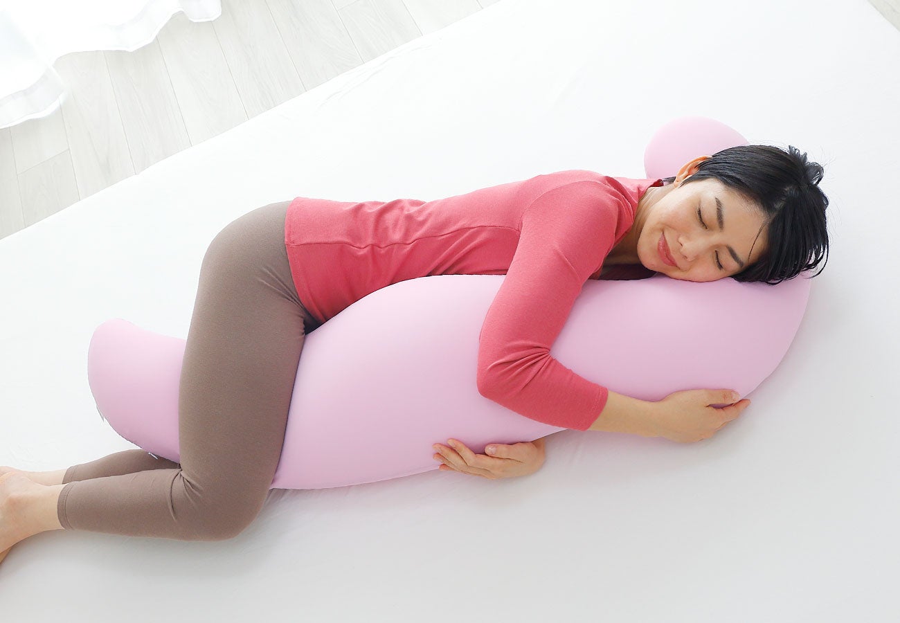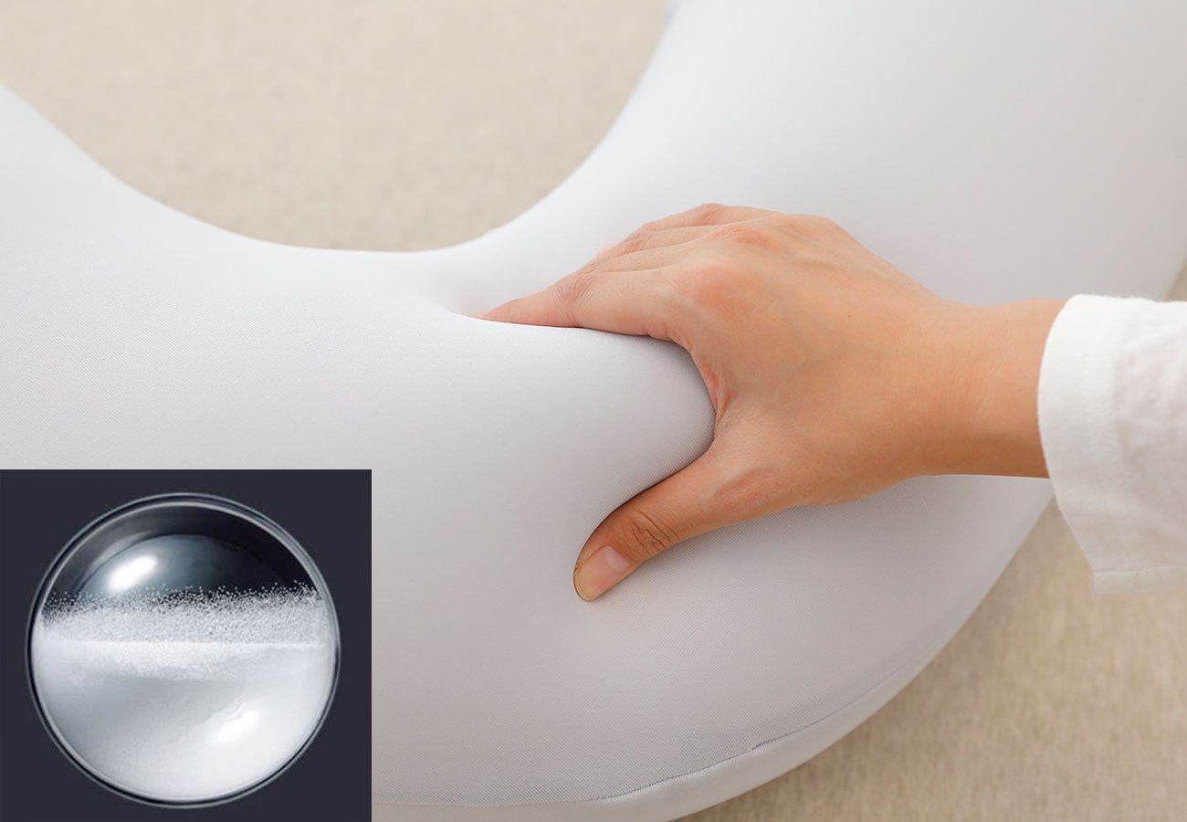抱き枕の中素材に直径1mm以下の小さなビーズ「パウダービーズ(R)」をたっぷりと使用することで、モチモチ、ムニュムニュとした感触に。パウダービーズは柔軟性と流動性に優れているので、身体の形・動きに合わせて自在に形状を変え、ぴったりフィットします。