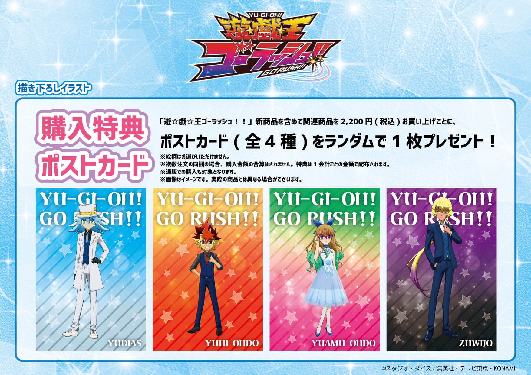 TVアニメ『遊☆戯☆王ゴーラッシュ!!』のグッズをご購入いただいた方には、ユウディアスたちの描き下ろしイラストを使用したポストカード(全4種)をプレゼント!