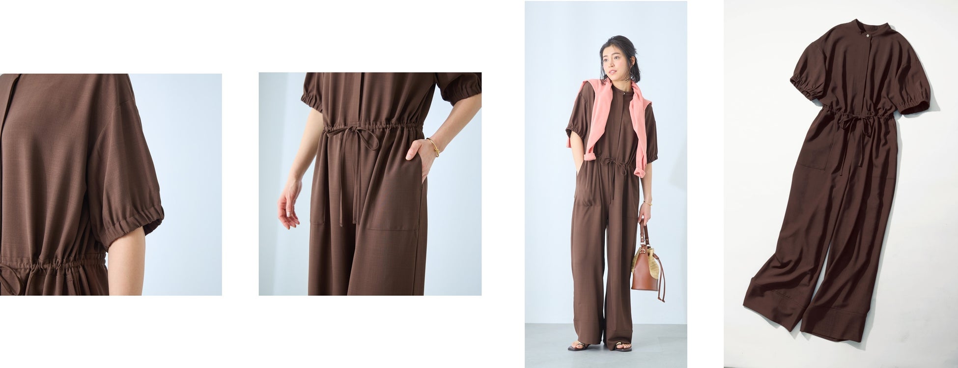 微光沢素材にふんわりとした袖を組みわせることで、シャープになりすぎない柔らかい印象に仕上げました。ウエストリボンでシルエットを調節できたり、二の腕を覆う肘まである袖丈で体型カバーが叶います。1枚でコーディネートが完成するこのオールイワンは石上さんもおすすめの一着です。