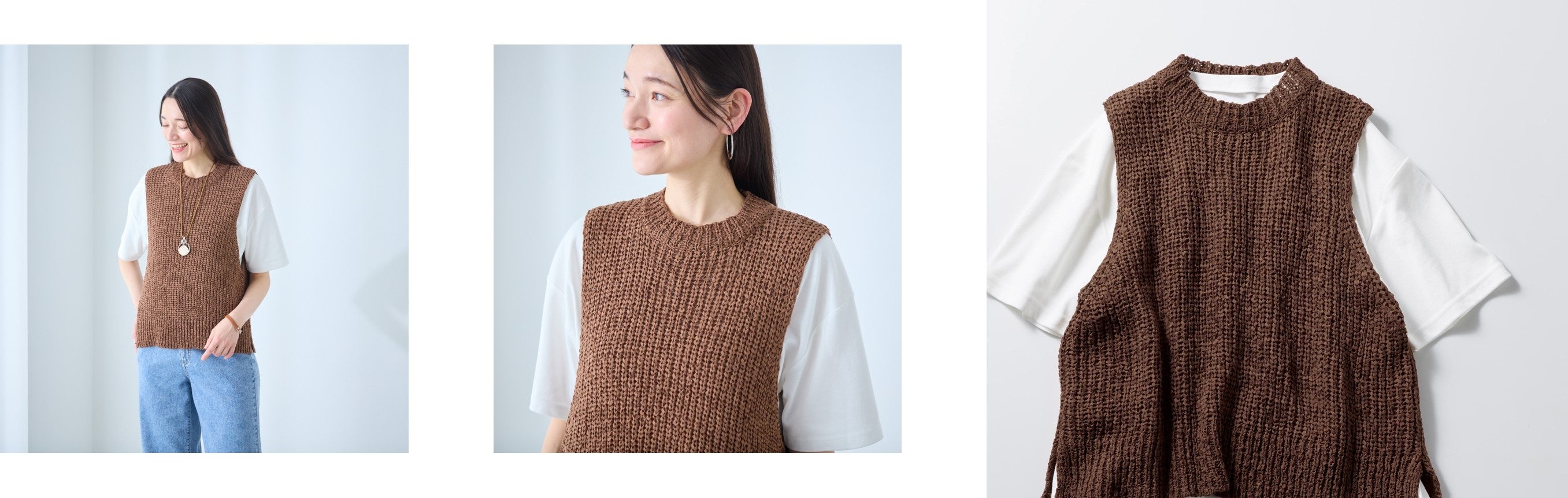 Tシャツ一枚だと心許ないけれど、アクセであれこれ盛るのは苦手…そんな声にお応えして、アクセ感覚で重ねられる軽くて涼しいベストとTシャツのセットです。ベストは腕がほっそり見えるようにアメリカンスリーブ風のカッティングを施しました。セットのTシャツやシンプルなトップスと重ねることで、コーディネートにアクセントを加え、すっきりとした印象を演出します。