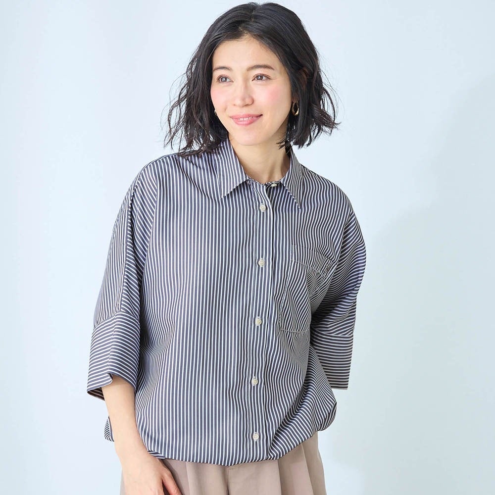 オーバーサイズのストライプシャツは、気になる二の腕をすっぽり覆う長めの袖丈と裾のドロストリング(紐)が特長です。ボトムスとのバランスに合わせて、シャツの裾を絞ってシルエットを変化させたり、タックイン風の装いにすることも可能です。身幅はゆったりしながらも 丈短め・裾絞りができるので、 バランスのいいシャツコーデが簡単に完成します。