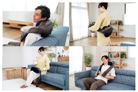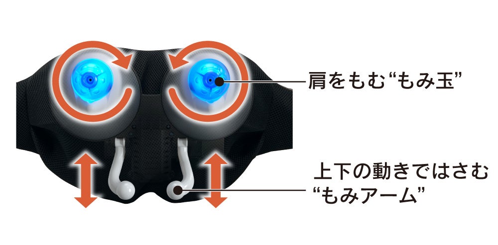 従来のネックマッサージャーと同様の回転式のもみ玉に加え、首元から肩をはさみもむ「肩もみ」の感覚を体感できる「もみアーム」を追加することで、同時に首と肩の広範囲へのもみほぐしを実現しました。「もみアーム」の先端はピンポイントなマッサージが可能な小さな球体形状が上下可動するようになっているため、首から肩にかけて”はさむ”ようにもみほぐしてくれます。また、従来モデルにも搭載されていた、もみ玉の「回転スピード」と「回転方向」の切替や「ヒーター」機能を搭載。それぞれの機能を組み合わせることで、気分やコンディションに合わせて好みのもみ方が調整でき、人の手の温もりのようにじんわりと心地良いもみほぐしを体感いただけます。