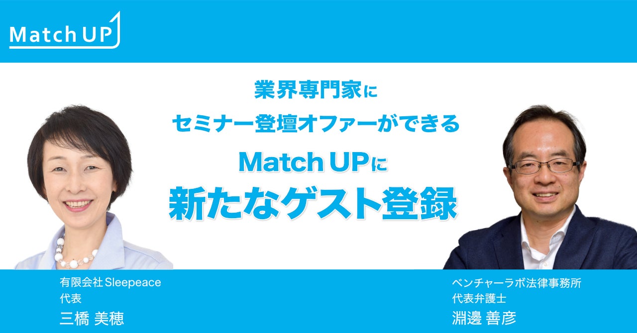 業界専門家にセミナー/イベント登壇のオファーができる「Match UP」有限会社Sleepeace 三橋 美穂氏、ベンチャーラボ法律事務所 淵邊 善彦氏などが新たにゲスト登録!