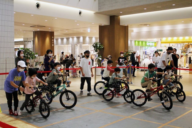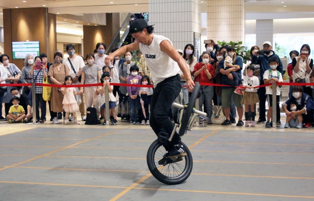 続いて、BMXステージパフォーマンスが行われました。ステージには、松戸市在住の世界を代表するプロライダーの佐々木元選手、莊司ゆう選手、若手期待の川口朔来選手が登場。集まった多くの観客の前で圧巻のパフォーマンスを披露すると、会場からは大きな拍手が沸き起こりました。その後のBMX体験会では参加した子どもたちが目を輝かせながらBMXの楽しさを体験していました。