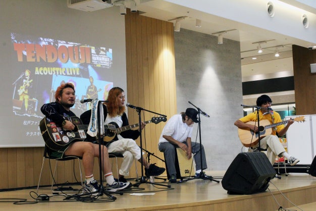 「松戸ファンフェスタinテラスモール松戸」のスタートを飾るのは、松戸市出身4人組ロックバンドTENDOUJIによるアコースティックライヴ。普段のロックなテイストとは違い、アコースティックにアレンジされた全8曲が披露されると集まったファンを魅了。