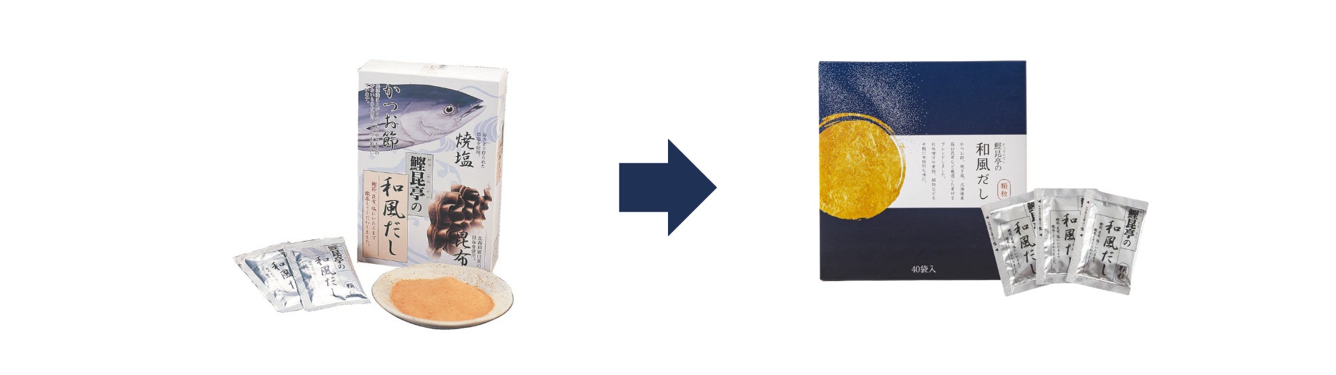 これまで、生協やカタログ通販などを中心に販売してきた『鰹昆亭の和風だし』は、50代以上のリピーターが多く、手軽でおいしい、飽きが来ない素朴で自然なおだしとして、好評をいただいております。より多くの方に『鰹昆亭の和風だし』を知っていただきたいという思いから、パッケージを大幅にリニューアルいたしました。