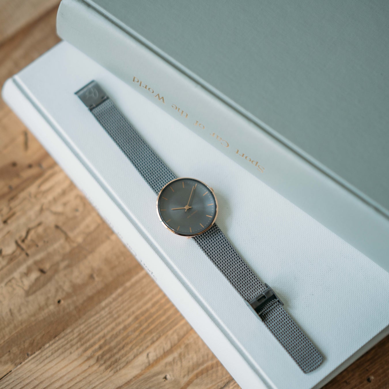 アルネヤコブセンのウォッチシリーズの特徴の一つであるドームガラスが、クラシカルで知的な印象を与えます。