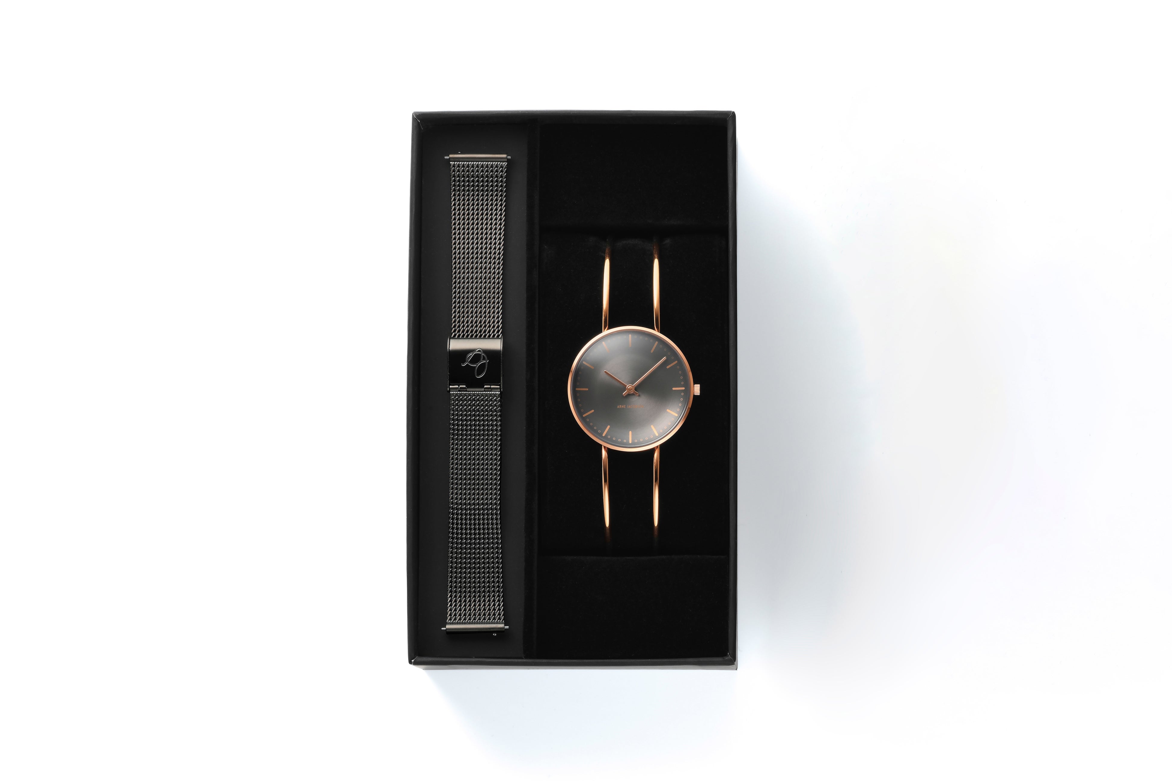 ボックスセットには、アクセサリーのように腕元を彩るバングルストラップが付属します。ワンタッチで交換可能で、メッシュストラップとの付け替えにより活用の幅も広がります。