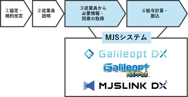 事業者は、給与のデジタル払いを希望する各従業員より、デジタル給与の支払い先となる口座情報や希望する金額(上限20万円まで)や支払開始時期などの必要情報や同意の取得が必要となりますが、MJSシステムのワークフロー機能をご利用いただくことで、予め用意されたテンプレートを用いて手間なく簡単に必要な情報と同意を取得することができるようになります(※3)。これにより、事業主と従業員双方の給与デジタル払い対応に伴う手続きの負荷軽減と、個々のニーズにあわせた給与払いによる従業員の満足度と利便性の向上を実現します。