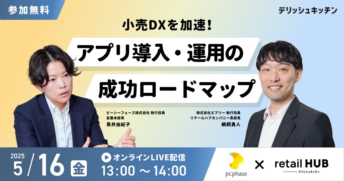 株式会社エブリー(本社:東京都港区、代表取締役:吉田 大成、以下エブリー)が運営する小売業向け統合ソリューション『retail HUB』は、5月16日(金)にピーシーフェーズ株式会社(本社:東京都渋谷区、代表取締役:吉田 和弘、以下ピーシーフェーズ)との共同ウェビナーを開催します。「小売DXを加速!アプリ導入・運用の成功ロードマップ」をテーマに、開発スタイルの異なる2社の視点から、アプリ導入・運用のポイントをお話しします。
