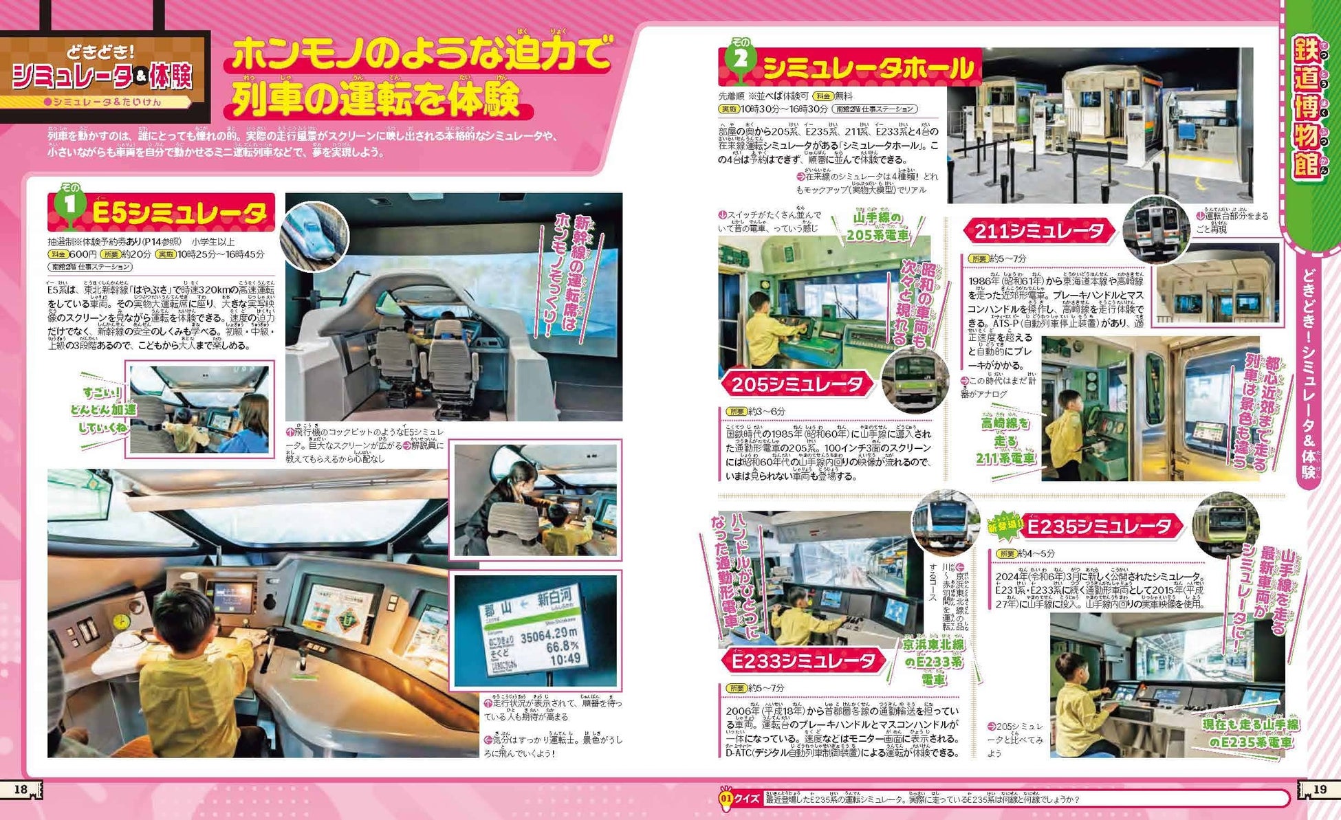 各館のフロアマップはもちろん、ミュージアムに行くなら必ず体験したいシミュレータの予約や抽選、利用券の購入方法、鉄道ジオラマの上演時間、展示車両に関する情報などを掲載。るるぶらしい楽しい誌面で展開しています。