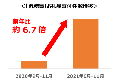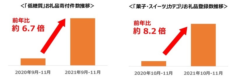 ■「低糖質」お礼品の寄付件数が前年同期比約6.7倍に伸長、「菓子・スイーツ」カテゴリのお礼品登録数も約8.2倍に増加!