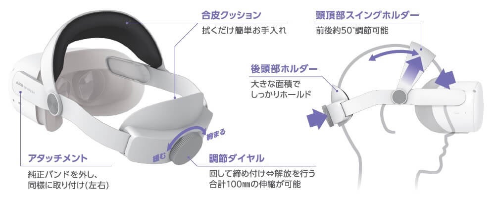 “ハイホールディングバンド”は、後頭部下側/額/頭頂部にVRヘッドマウントディスプレイ本体の荷重を分散することで、頬に集中する負荷を軽減します。Meta Quest 2の既存のアタッチメントに取り付けるだけで装着は完了。細かな調整ができる機能により、頭部にしっかり固定でき、ぶれにくい構造です。クッションには汗などを拭き取りやすい合成皮革を採用しています。