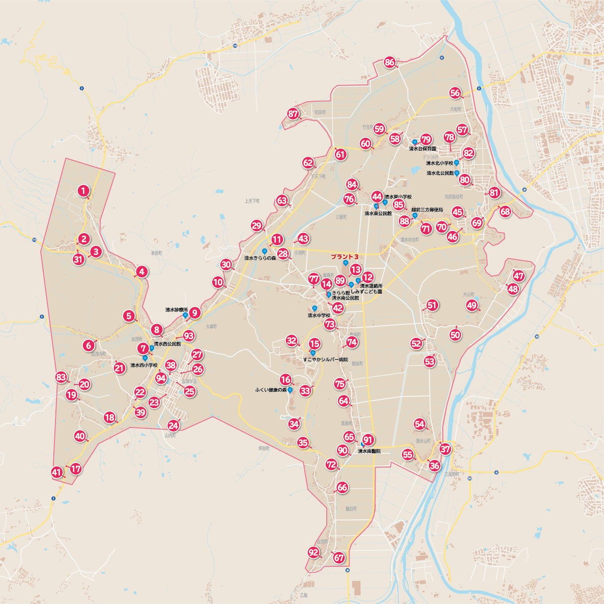 ② 病院・公民館・公園・学校など、住民の利用頻度が高い94カ所を乗降地点として設定しています。
