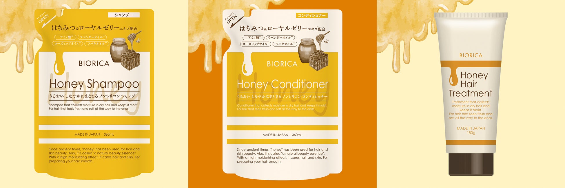 シリーズ共通で配合された“はちみつ”と“ローヤルゼリーエキス”が水分を抱え込み、髪の芯から毛先までうるおってまとまる髪に。パサつきなどのダメージをケアし、乾燥して硬くなった髪もみずみずしく柔らかな手触りに整えます。