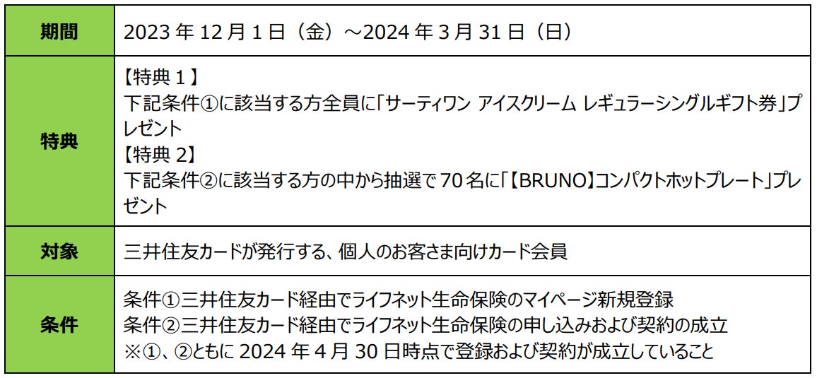 三井住友カードのホームページを経由して、ライフネット生命保険のマイページ新規登録いただいた方全員に「サーティワン アイスクリーム レギュラーシングルギフト券」をプレゼント!