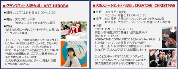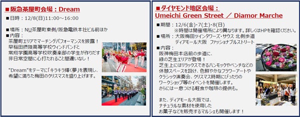梅田でのお仕事帰りや、お買い物・お食事のついでに、また街中がクリスマスイルミネーションであふれる梅田を体感しながら、クリスマスマルシェや音楽イベントなどで彩られた各会場コンテンツをぜひお楽しみください。