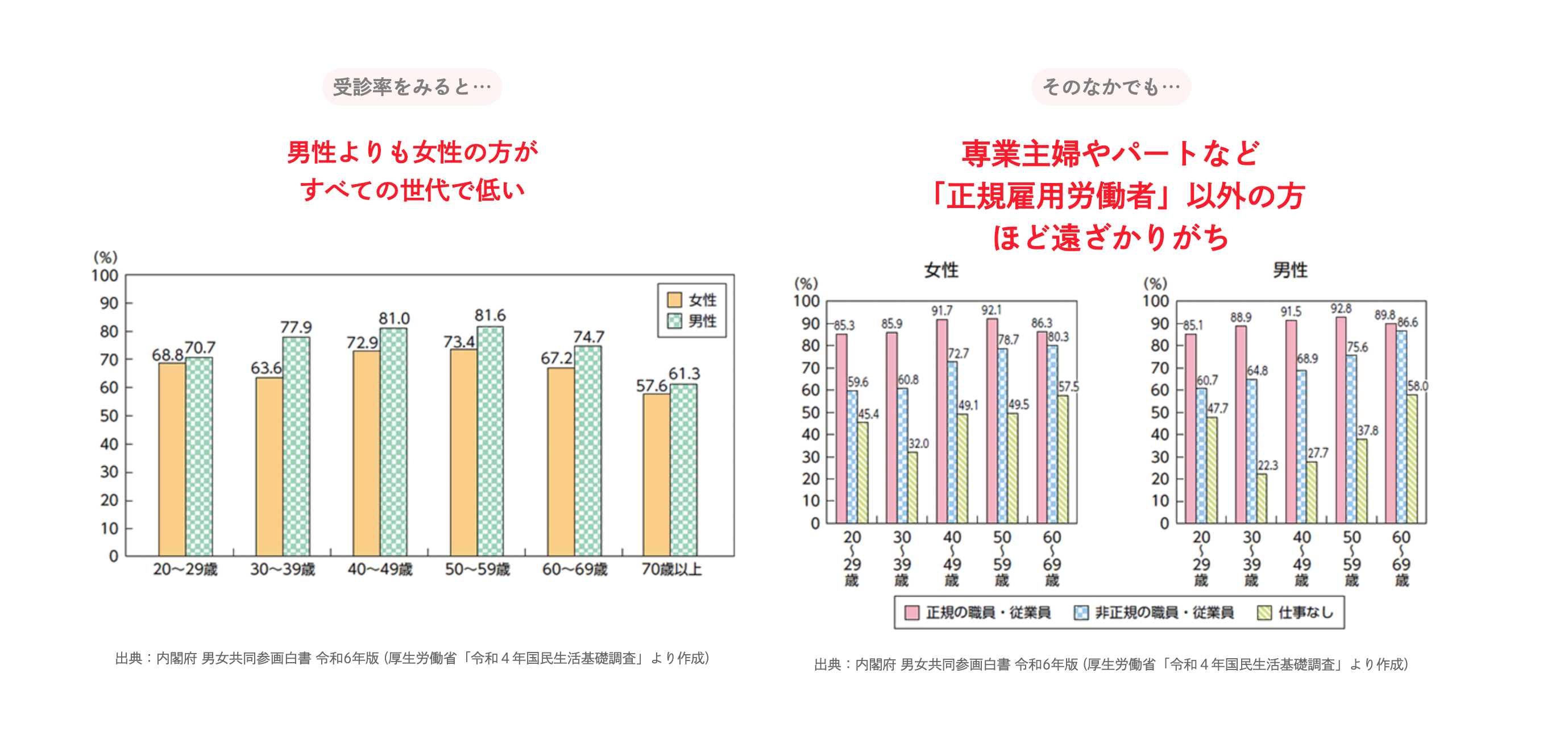 さらに「正規雇用以外」の方ほど健診を受けにくいというデータもあり(※2)、専業主婦・パートなど多くのお母さんたちが自身の健康に意識を向ける機会が少ないことが推測されます。
