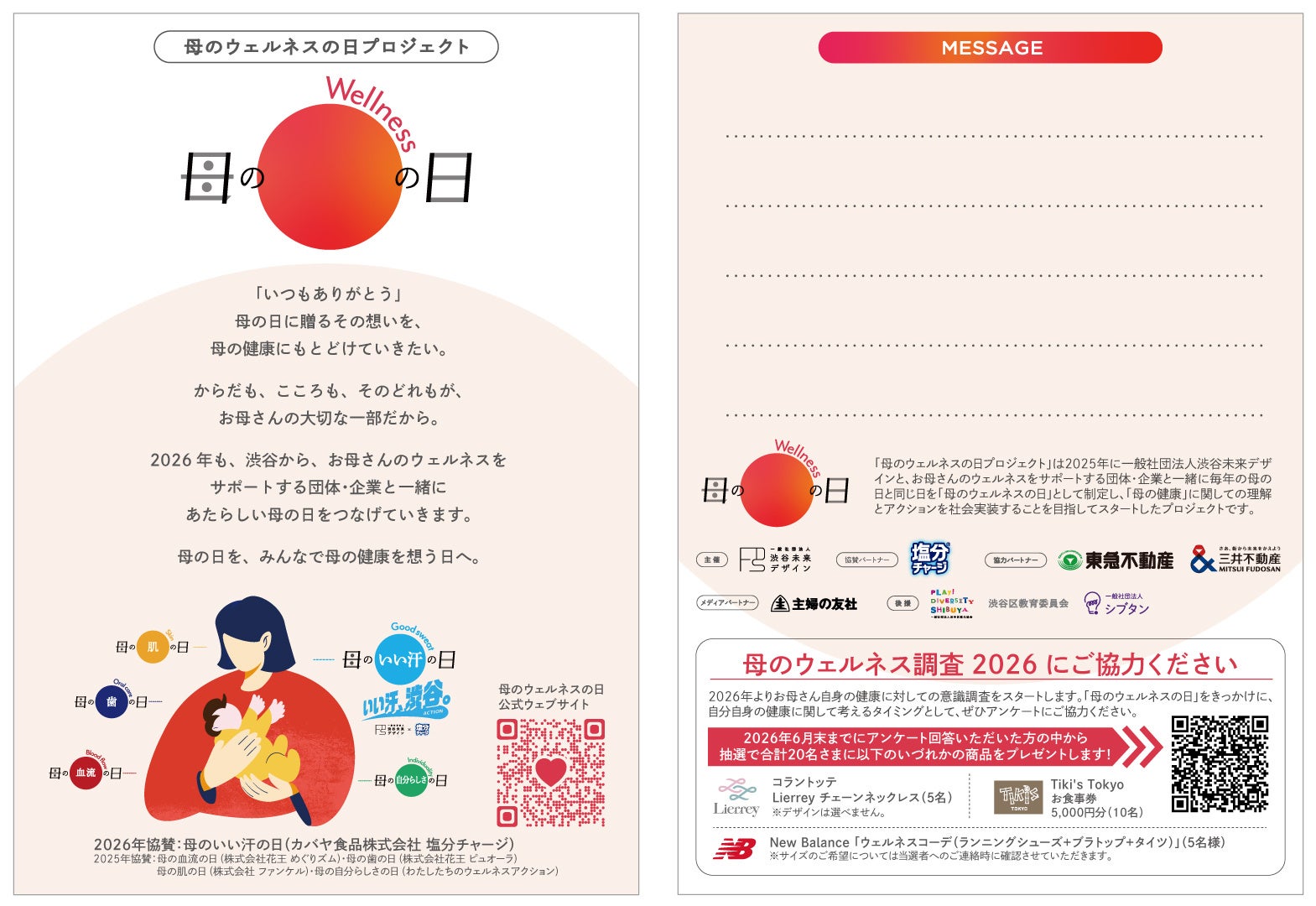 一般社団法人渋谷未来デザイン(代表理事:小泉秀樹、以下、渋谷未来デザイン)は、渋谷区を活動拠点に 心身ともに健やかに自分らしく生きられる社会の実現を目指すプロジェクト「わたしたちのウェルネスアクション(https://womens-wellness-action.com/)」を推進しておりますが、昨年度に引き続き 全国の母たちの健康意識の向上を目指して、「母のウェルネスの日プロジェクト」を渋谷から発信いたします。