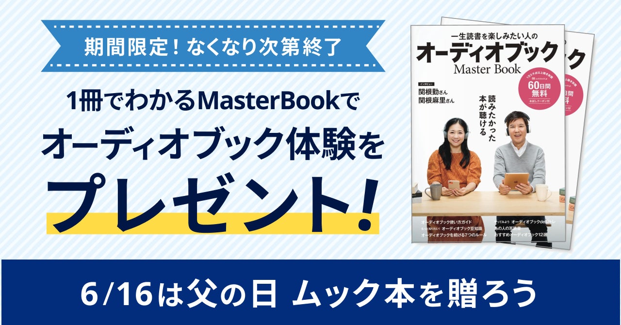 オーディオブック書籍ラインナップ数No.1(※1)の「audiobook.jp」を運営する株式会社オトバンク(本社:東京都文京区、代表取締役社長:久保田裕也、以下「オトバンク」)は、6月16日の「父の日」に向けて、プレゼントキャンペーンを開催します。5月22日(水)~6月16日(日)までにご応募くださった方、先着100名様にaudiobook.jpの60日無料クーポンが付いたムック本『一生読書を楽しみたい人のオーディオブックMasterBook』をプレゼントいたします。