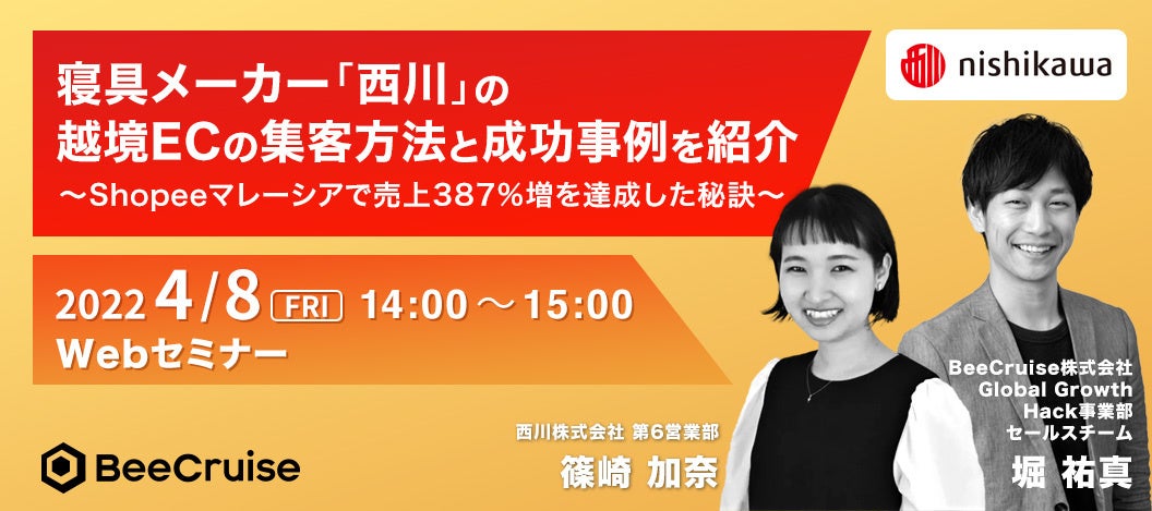 越境EC 流通総額 No.1(※1)の海外向け購入サポートサービス「Buyee」を運営するBEENOSグループにおいて、越境ECおよびジャパニーズコンテンツの海外進出をサポートするBeeCruise株式会社(以下「BeeCruise」)は、越境EC支援ウェビナーを4月8日(金)に開催します。台湾・東南アジア最大級ECモール「Shopee」への出店サービスをご利用いただいている西川株式会社様をゲストに迎え、越境EC導入の経緯から、越境ECにおける販売戦略、海外向けプロモーションなどを解説いただきます。
