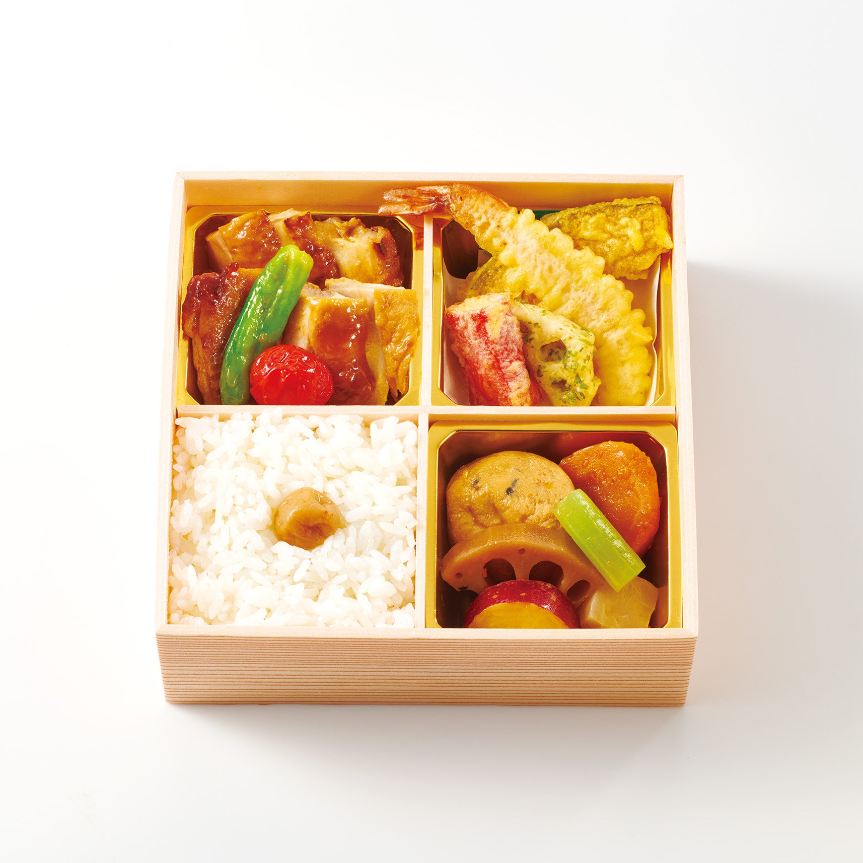鶏の照焼をメインに、天ぷらや煮物を詰め合わせたバランスのよい限定弁当です。