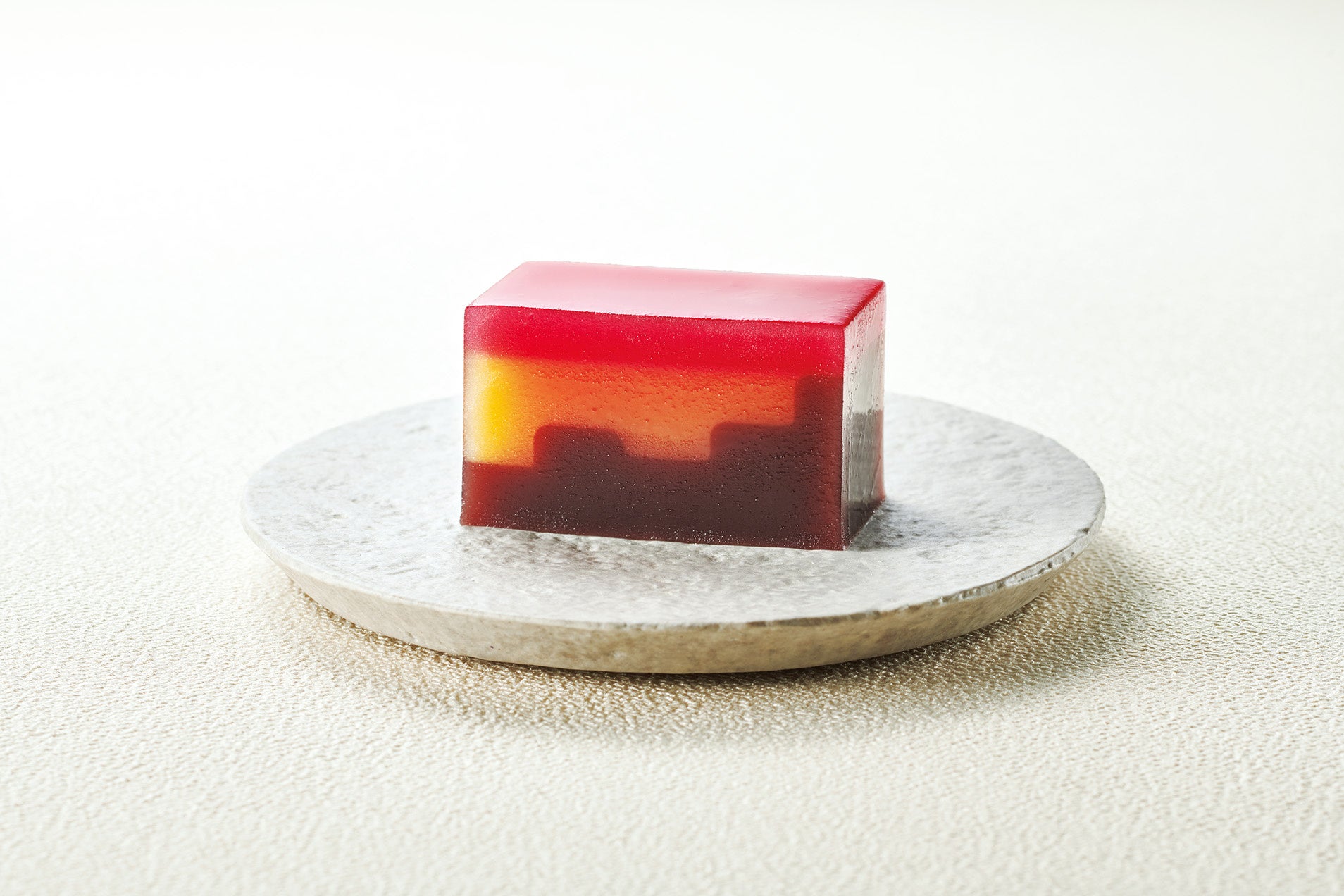夜明けの空と街並を、斬新な構図と力強い色合いで表現。これから始まる一日を予感させる意匠の特製羊羹です。