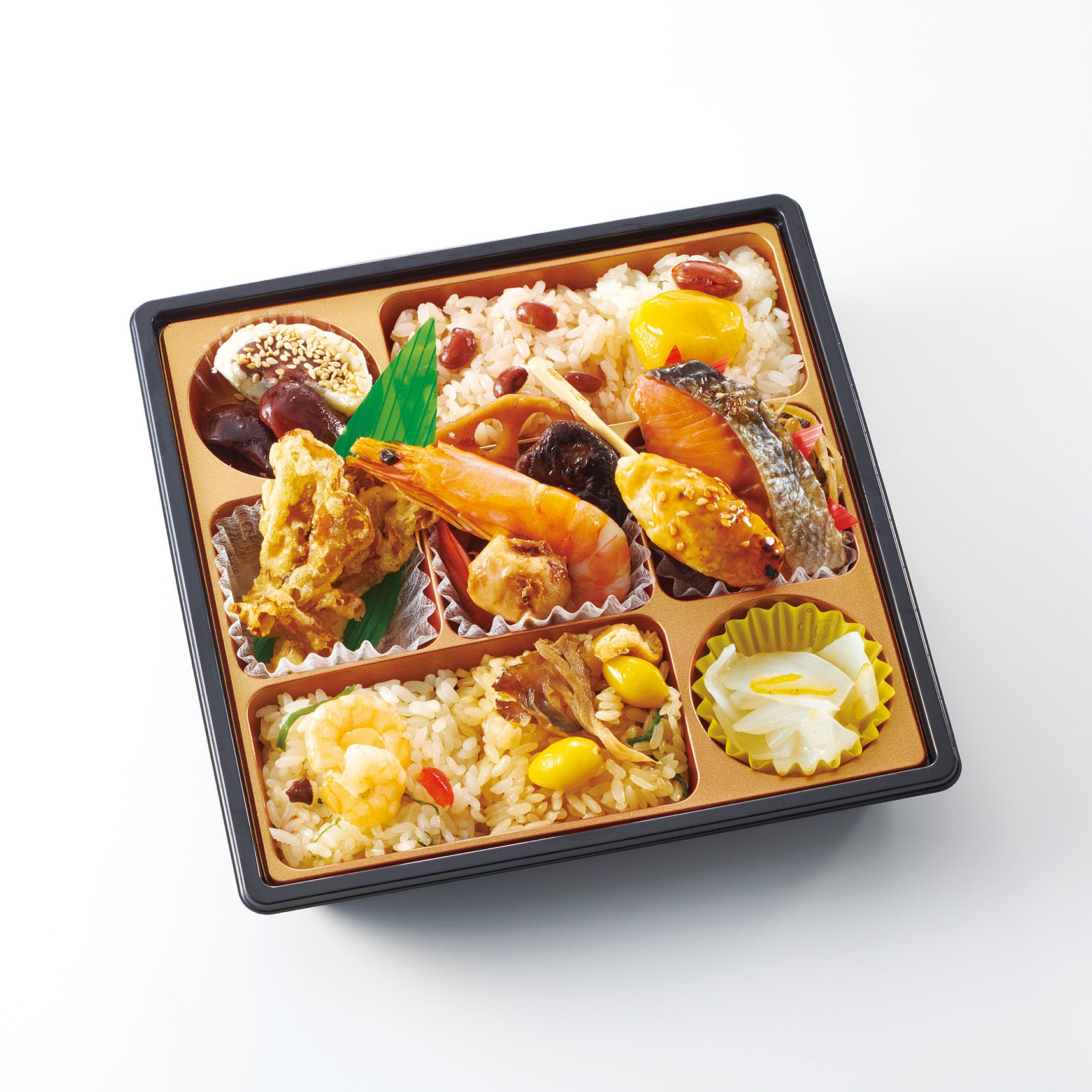鮭塩焼き、旬の舞茸天ぷら、海老、煮物などを詰め合わせました。おこわは4種類お楽しみいただけます。