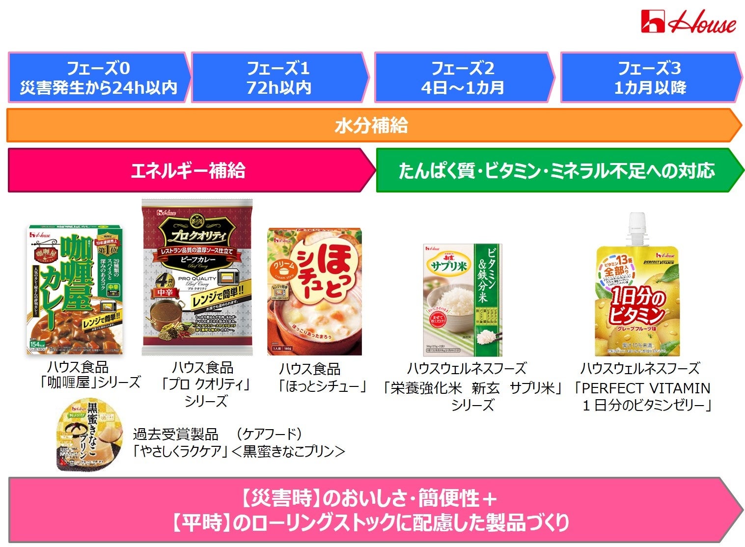 ハウス食品グループでは、フェーズ0~1では普段から食べ慣れているレトルトカレーやシチューで、フェーズ2以降では、ゼリーや強化米でビタミンを補給する対応を提案しています。