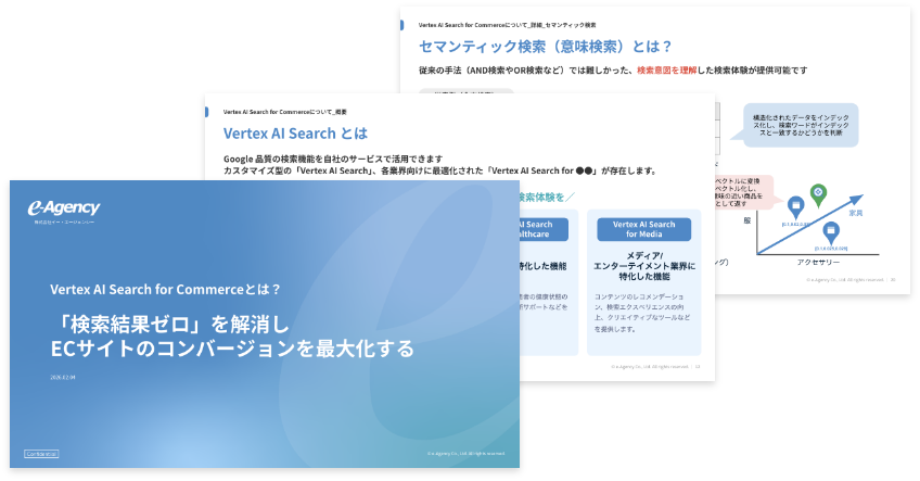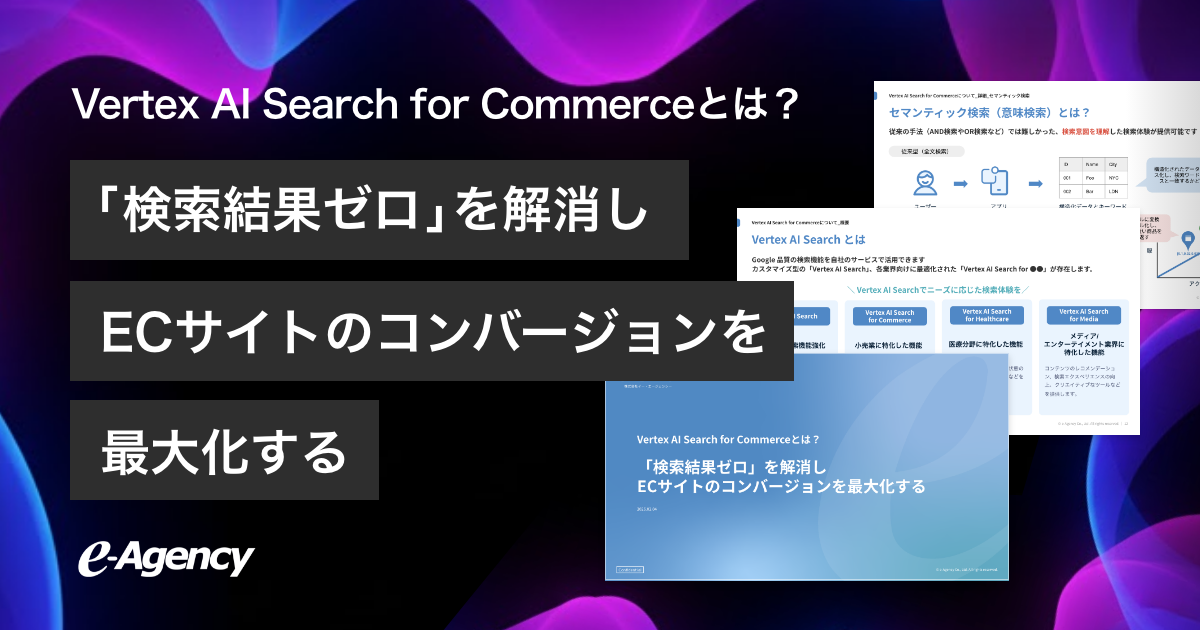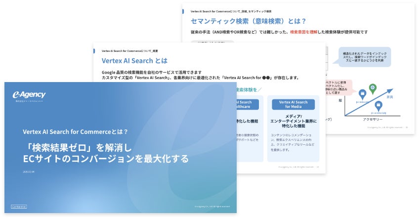 “おもてなしを科学する”株式会社イー・エージェンシー(本社:東京都千代田区、代表取締役:甲斐真樹、以下イー・エージェンシー)は、2026年2月12日、Googleの最新AI技術を活用してECサイトの検索・レコメンド機能を最適化する解説資料「Vertex AI Search for Commerceとは?『検索結果ゼロ』を解消し、ECサイトのコンバージョンを最大化する」を公開したことをお知らせいたします。