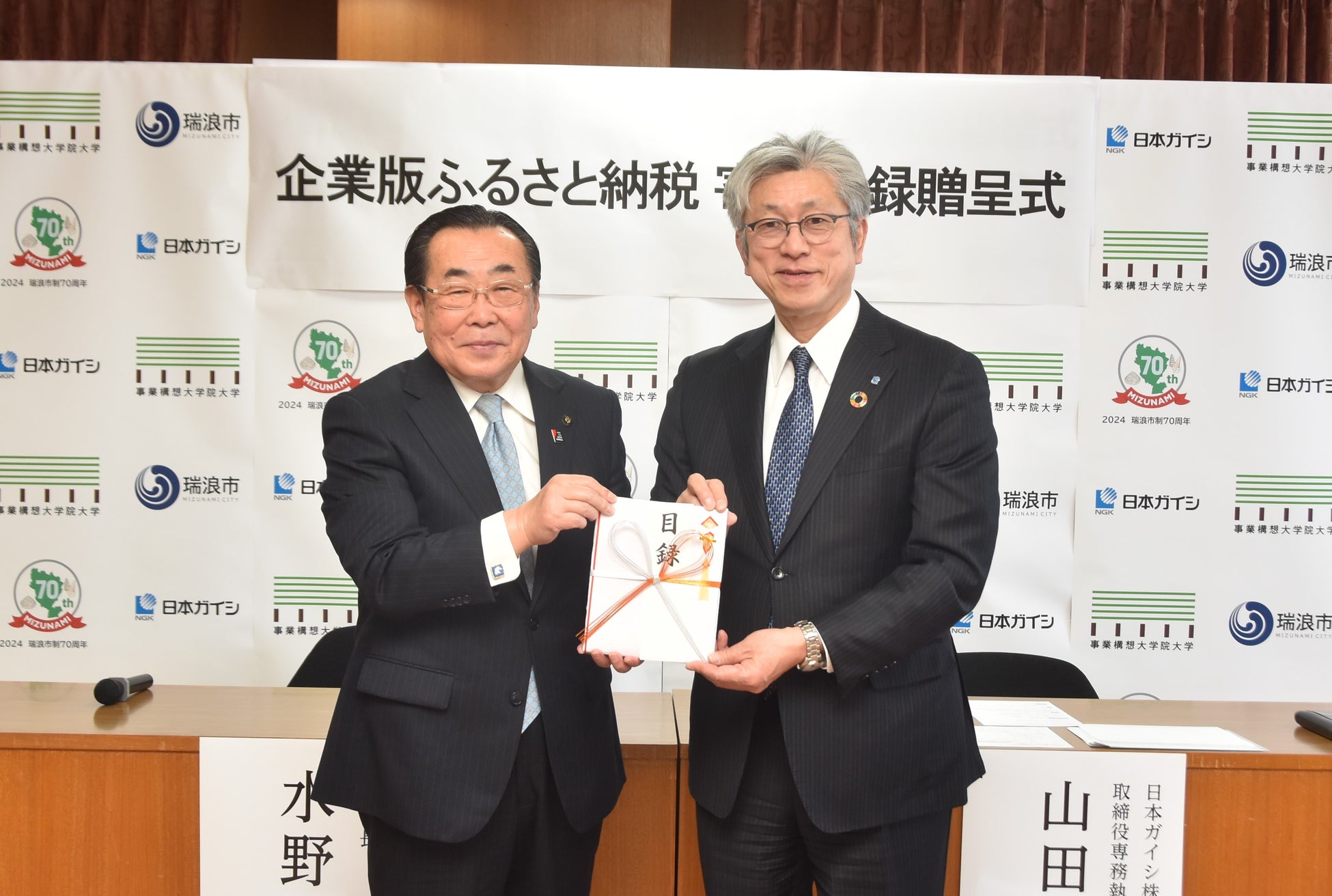 日本ガイシ株式会社から瑞浪市へ企業版ふるさと納税(地方創生応援税制)の寄付が行なわれました。本連携協定に基づき実施する瑞浪市の地方創生事業に活用します。