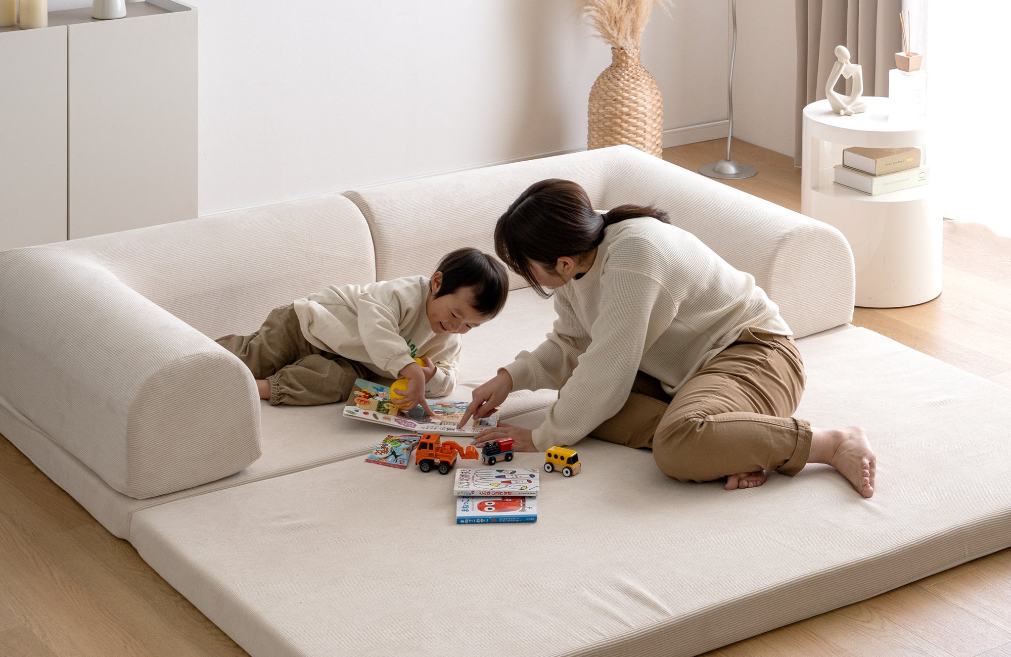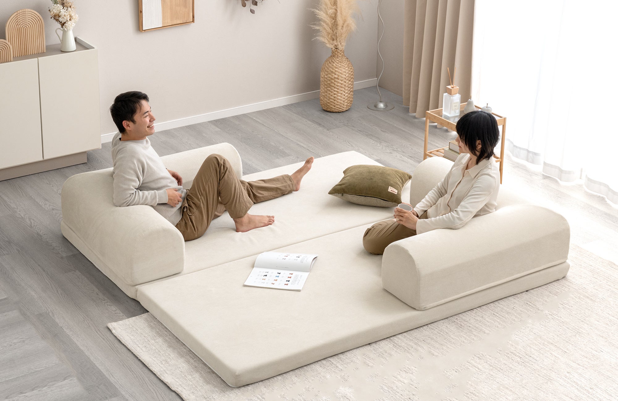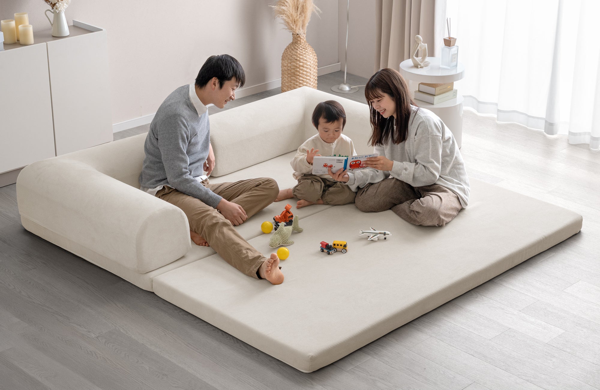 【タンスのゲン】たたんで広げて組み替えて、これ一台で座る・遊ぶ・寝るが丸ごと実現!折りたたみ可能な座面と好きな場所に配置できるL字クッションで、自由にアレンジ