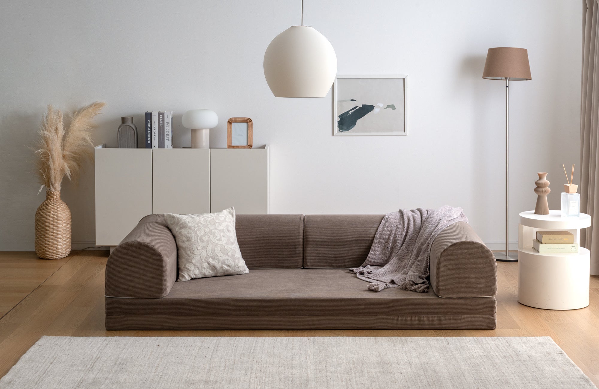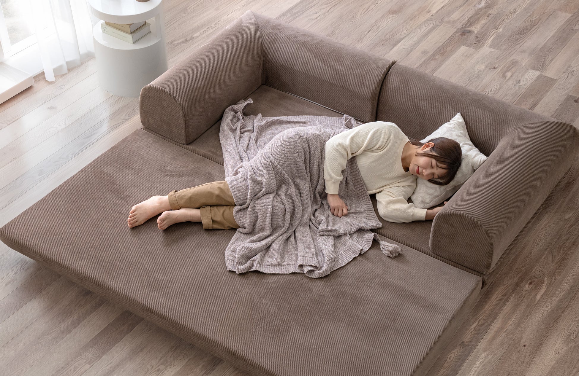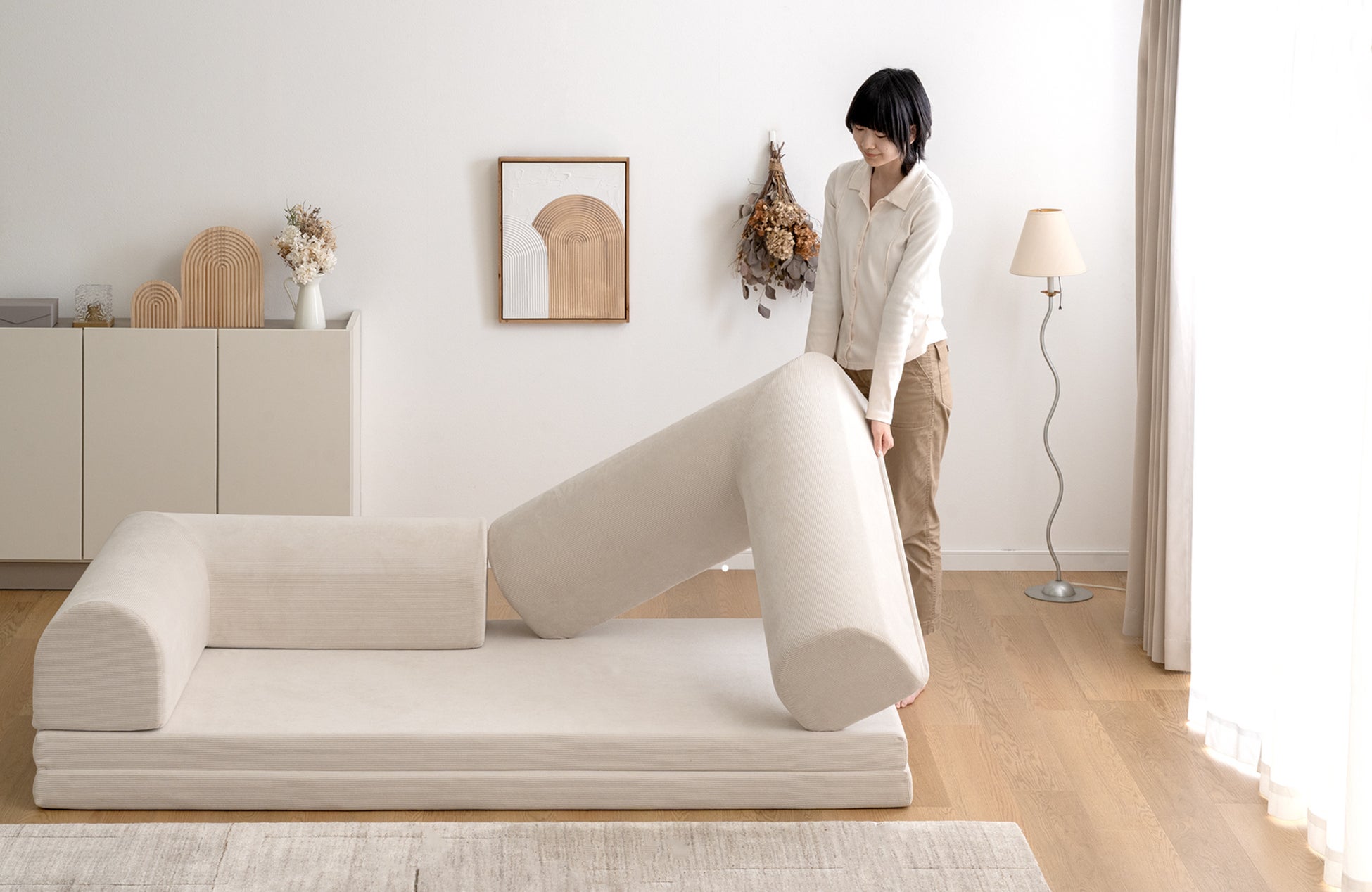 【タンスのゲン】たたんで広げて組み替えて、これ一台で座る・遊ぶ・寝るが丸ごと実現!折りたたみ可能な座面と好きな場所に配置できるL字クッションで、自由にアレンジ