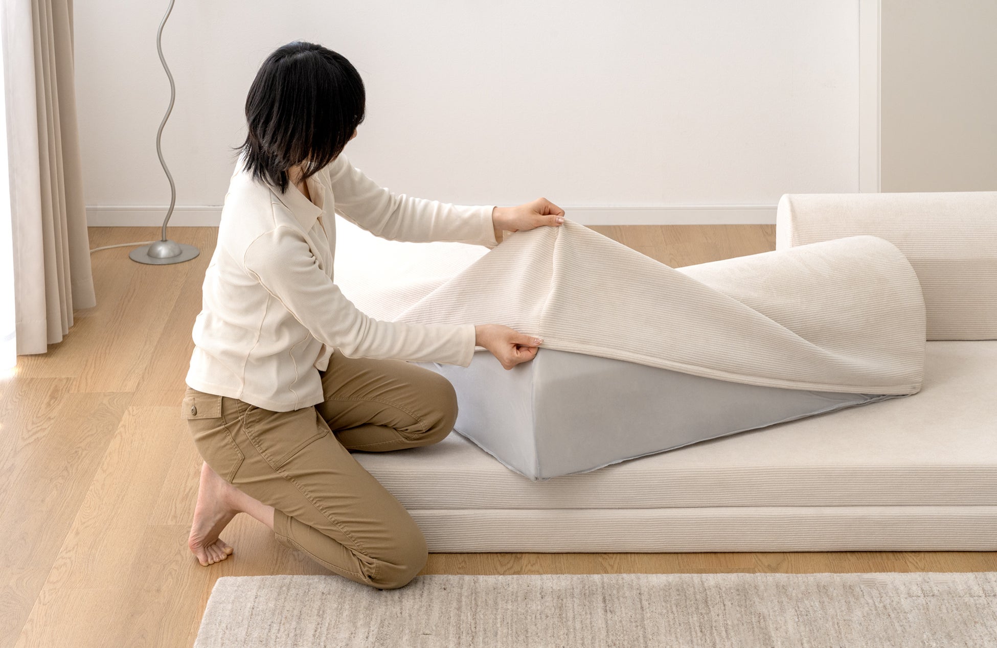 『折りたたみ組み換えソファ』のクッションと座面のカバーは取り外して洗うことができるので、いつでも清潔に保つことができます。また、カバーには夏はムレにくく、冬はひんやりしないオールシーズン快適に使用できるコーデュロイ生地を採用しております。