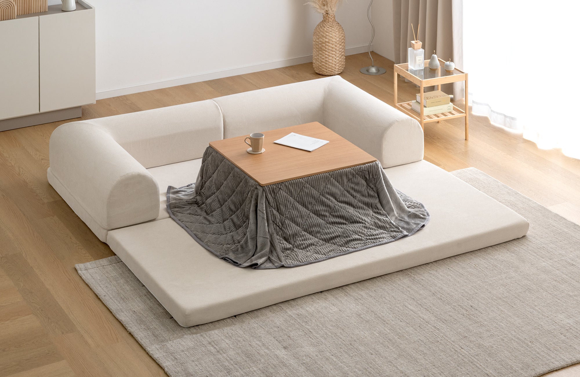 硬めの座面になっているので、座面を広げるとテーブルと併用することができ、寒い時期にはこたつと合わせて使用することもできます。