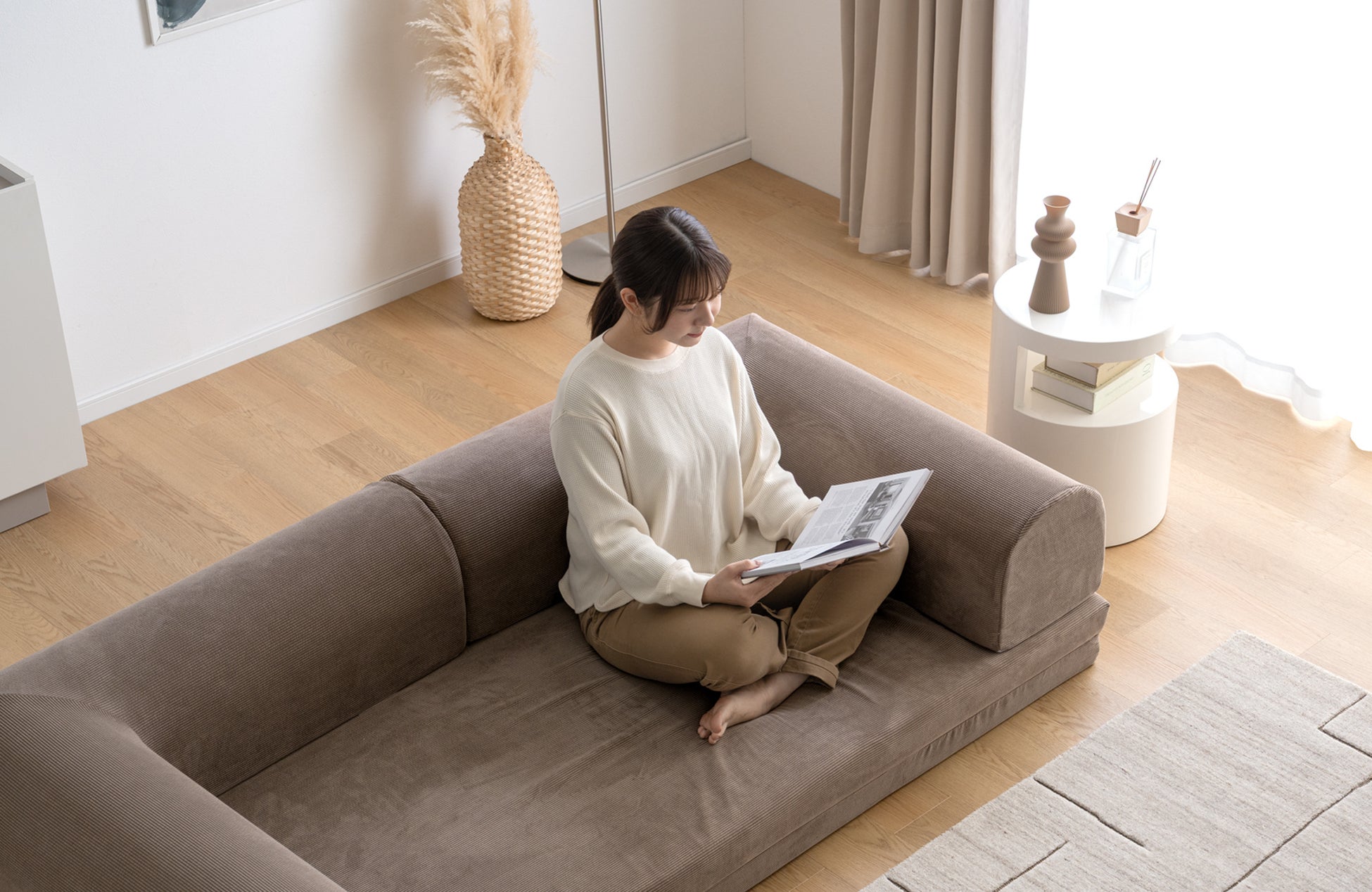 「ローソファ」のような座面をたたんだ状態では、圧迫感を抑えることができるため、お部屋をすっきり見せつつも、あぐらもかける広々とした座面になっているので、ゆったりとしたくつろぎを実現します。テレビを見たり、本を読んだりなど、一人でのリラックスタイムにぴったりです。
