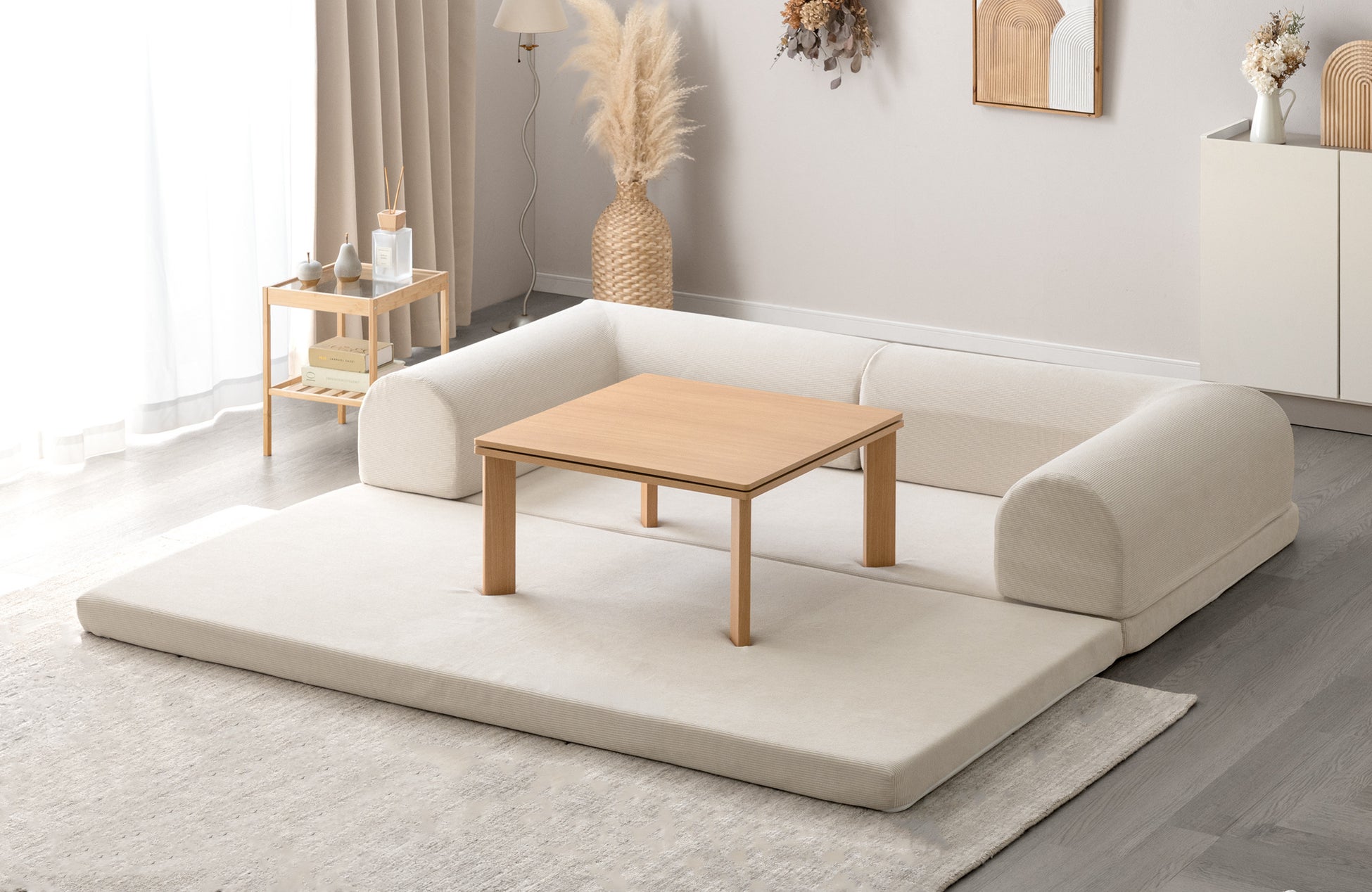 L字クッションを外した際の外寸は200cm×200cmと、キングベッド相当の大きさになり、来客時やお昼寝時のベッドとしてのご使用や、お子様や友人との遊びの空間としてもご使用いただけます。