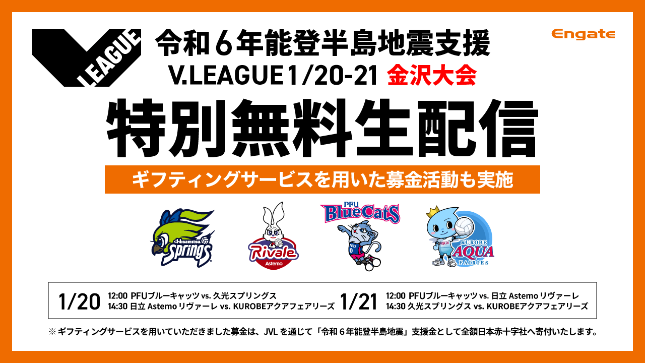 石川県・金沢市総合体育館で実施されるV.LEAGUE DIVISION1 WOMEN(V1女子)の試合をスポーツギフティングサービスの「Engate」で無料配信し、ギフティングサービスを用いた「令和6年能登半島地震」に対する募金活動を実施。