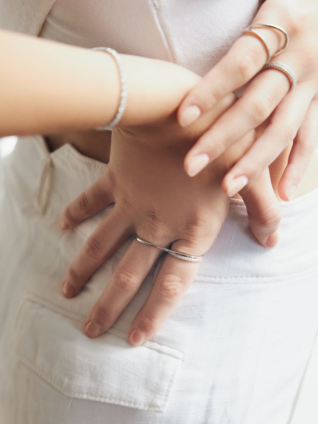 手元に取り入れると鮮度のあるスタイリングが楽しめる人気のダブルフィンガーリングに、シルバーカラー(画像中央)が新登場しました。2本の指に通すデザインのリングで、手のひら側に指に添う滑らかな曲線がつけられており、スタイリッシュな見た目と着用感の高さを両立します。