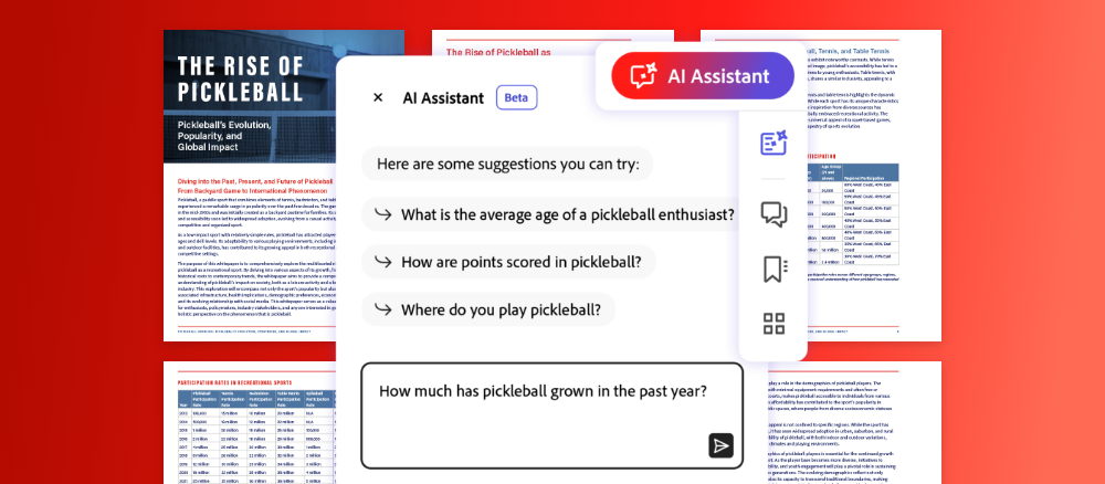 Acrobat ReaderとAcrobatのAI Assistantは、長文のドキュメントと膨大な情報を変革し、有益なインサイトとわかりやすく実用的なコンテンツを生成します。プロジェクトマネージャーは、会議のハイライトのスキャン、要約、配布を数秒で行うことができます。営業担当者は、提案書をパーソナライズし、クライアントのリクエストに数分で対応できます。学生は、入念なリサーチ作業に費やす時間を短縮し、分析とインサイトにより多くの時間を費やすことが可能です。ソーシャルメディアやマーケティング担当者は、主要なトレンドや問題を素早くまとめ、関係者向けに日々の最新情報を提供できます。AI Assistantは、電子メールの作成や、あらゆる種類の契約書のスキャンに要する時間を効率化し、世界中のナレッジワーカーと消費者の生産性向上を支援します。AI Assistantによってどのように作業時間を効率化し、より迅速にインサイトを得ることができるかについてはこちらの動画( https://www.youtube.com/playlist?list=PLaGRwR1U7ndCweCqeUFqq6G1zhCIZdK9z )をご覧ください。