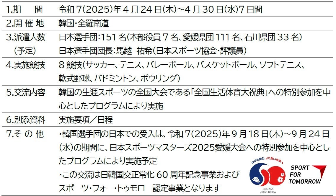 なお、本年9月に愛媛県で開催される、日本最大のシニア世代総合スポーツ大会「日本スポーツマスターズ2025」には、韓国選手団が特別参加します。